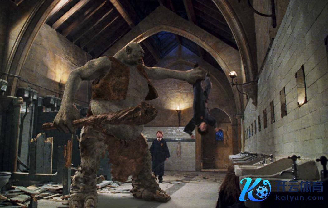 当巨怪误入女生盥洗室时,哈利和罗恩把它锁在了里面,但马上想起赫敏·格兰杰还在里面。两东谈主坐窝冲且归,和巨怪张开搏斗救同学,临了总算把巨怪打晕了。